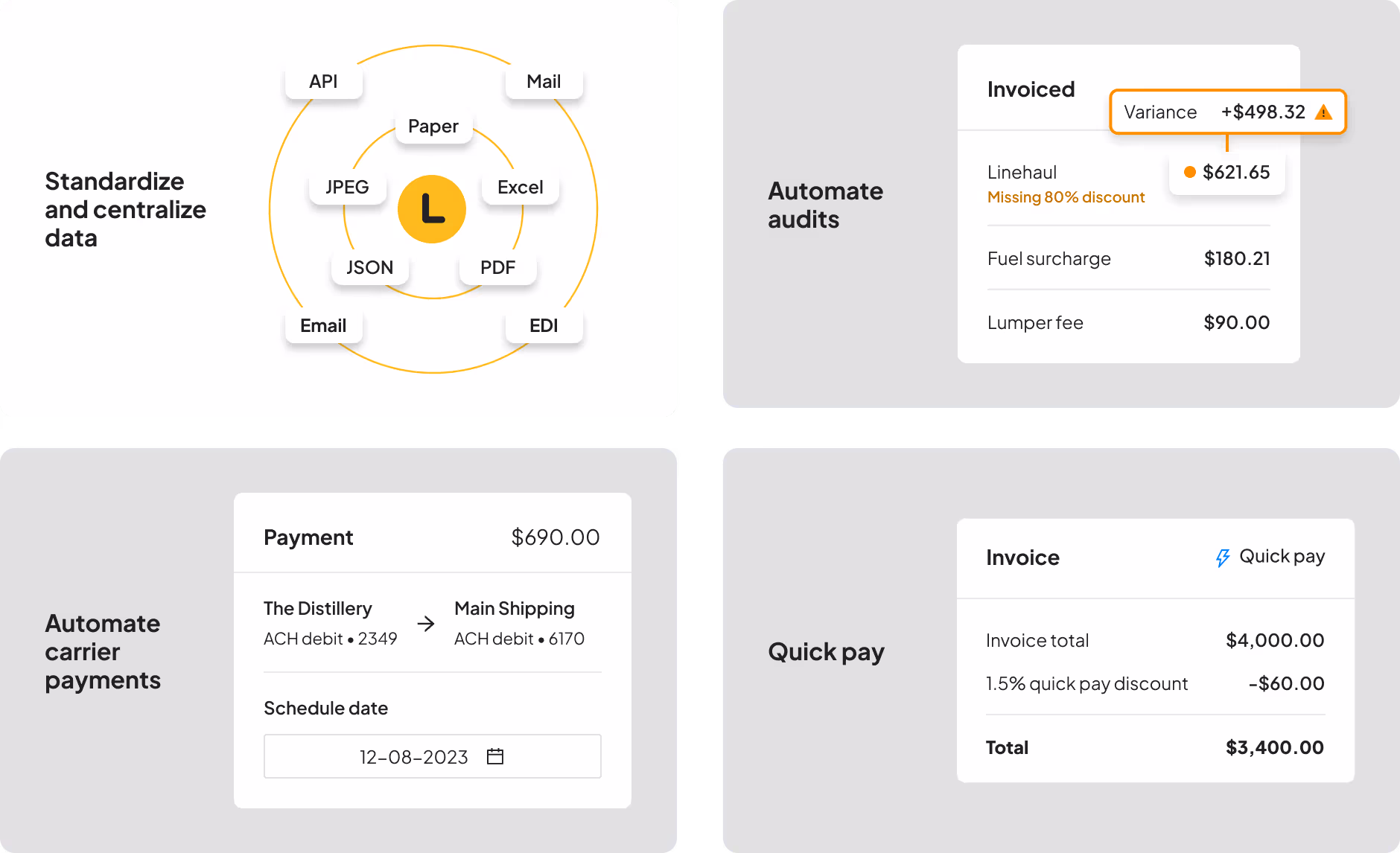 Carriers and 3PLs have different payment requirements. The payer needs flexible payment orchestration capabilities to meet different payees needs. Streamlined and digitized payment processes offer more flexible options for payees, which boosts the likelihood of invoices paying and getting paid at term.