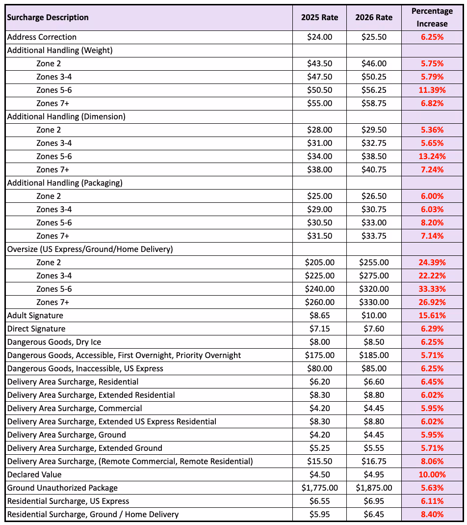 Figure 6: Percentage increase of common FedEx surcharges (2025 vs. 2026)