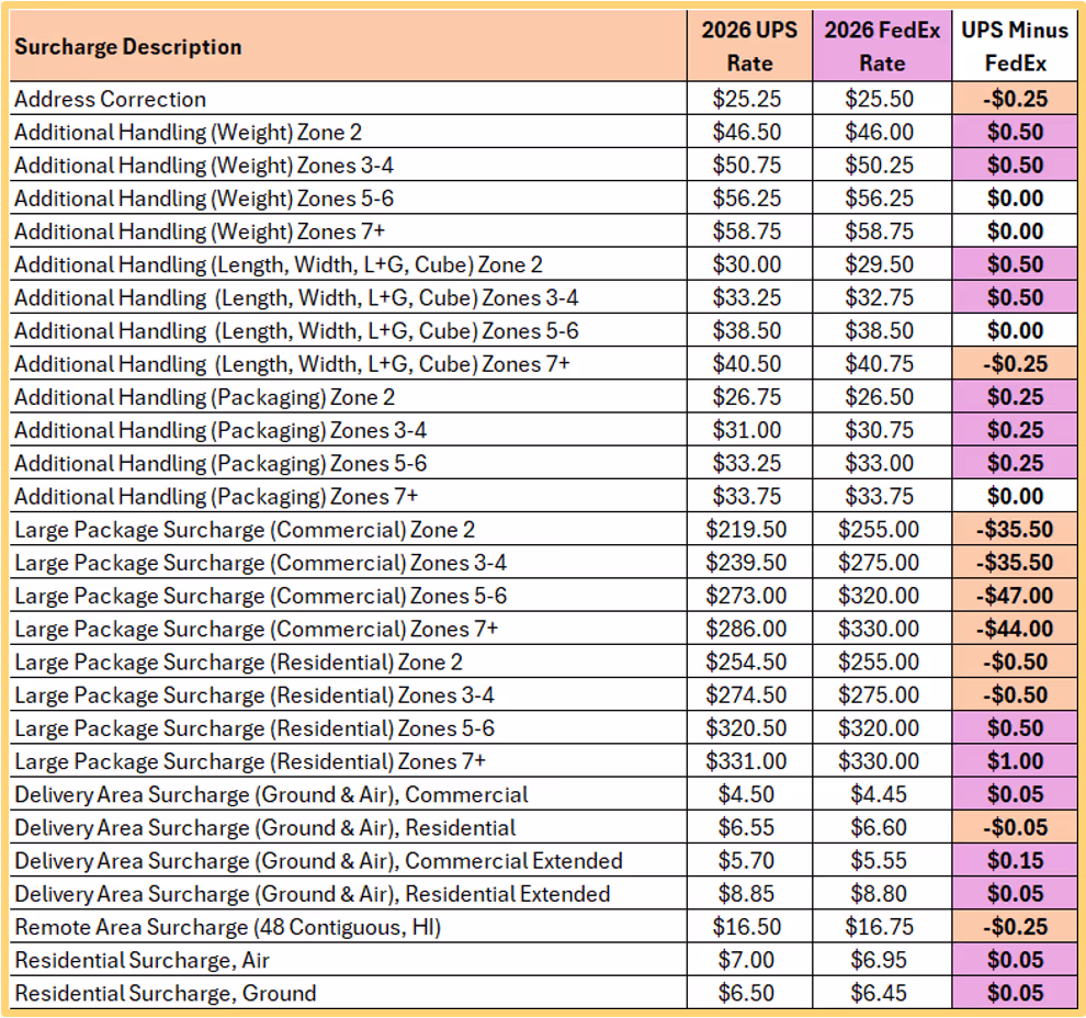 When Matt compared FedEx and UPS surcharges side by side, most line items were within a few cents of each other. A few categories, like large package and oversize for commercial shipments, showed much larger gaps. Shippers who do not track those deltas over time risk significant unplanned spend.